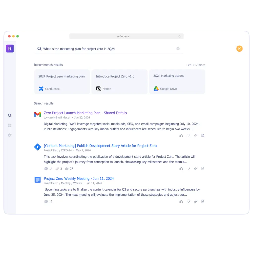 Refinder’s AI-driven enterprise search gives you seamless access to your company’s data, making it easy to find everything in one place.