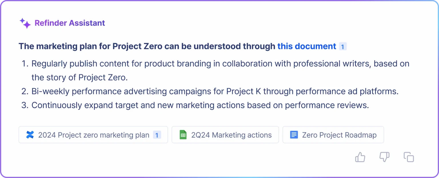 Refinder's AI assistant efficiently summarizes key business information, answers your questions, and provides reliable sources, streamlining your workflow.