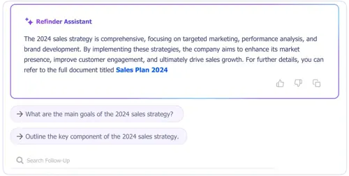 Using the context of previous questions and responses, Refinder suggests relevant follow-up questions for more profound insights.